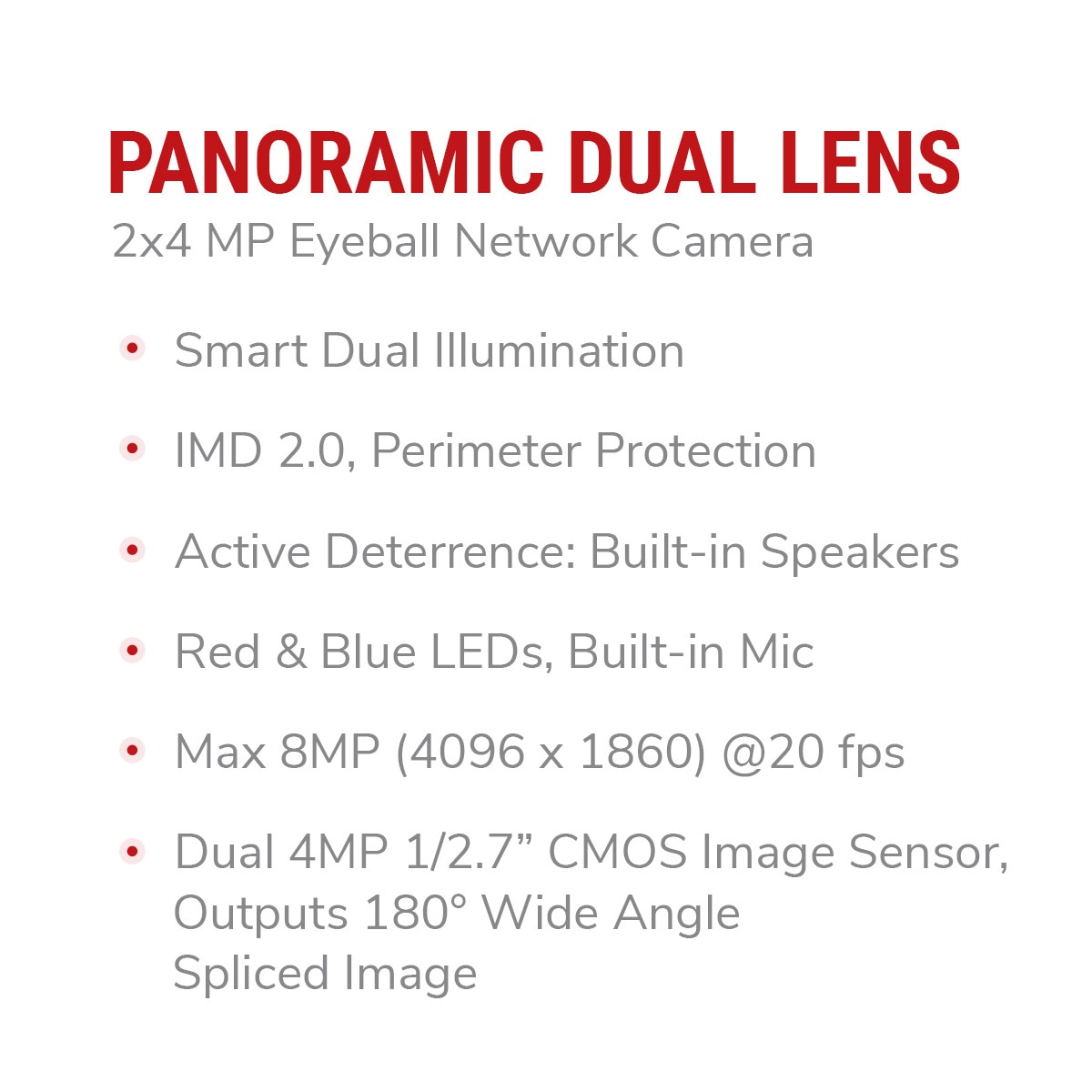 At its core, dual 4MP 1/2.7" CMOS image sensors seamlessly integrate to produce stunning 8MP resolution imagery (4096 × 1860) at up to 20 fps. With a 180° panoramic angle of view and dual 2.8mm lenses, this camera captures every detail in exceptional clarity, even in challenging lighting conditions, thanks to its remarkable low-light sensitivity of 0.005 lux@F1.4.